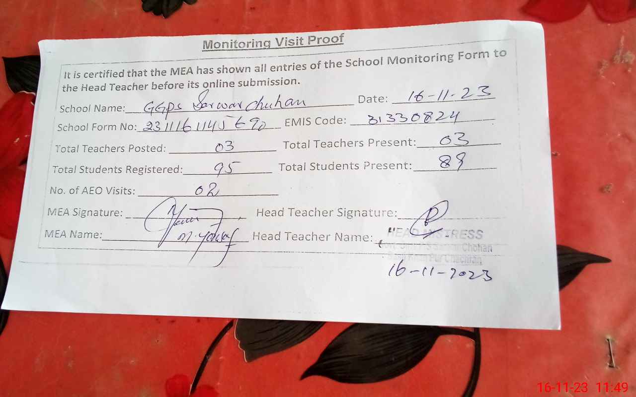 | EMIS Code: 31330824 | Name of School: GGPS SARWAR CHUHAN | |||