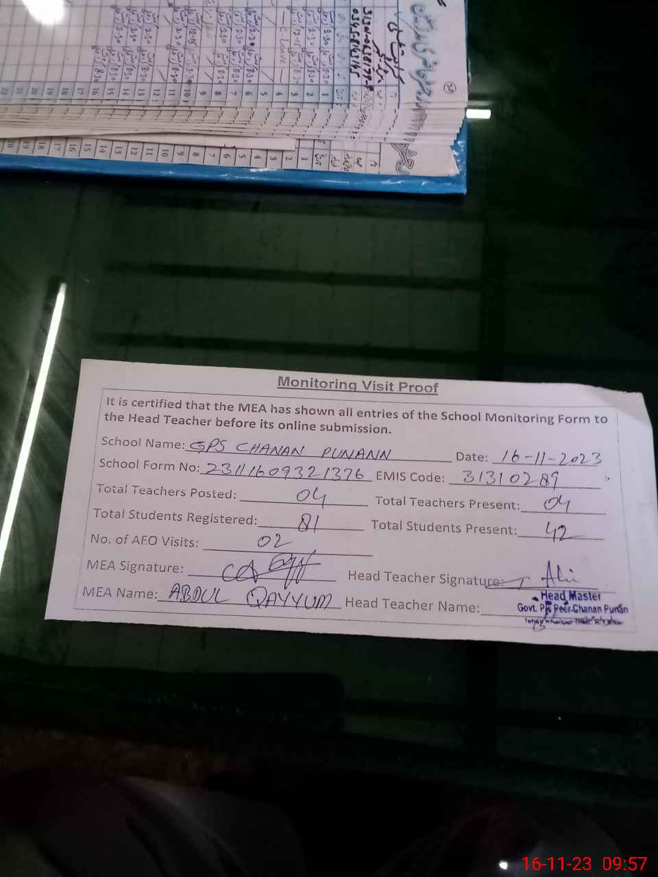 | Attendance Register | Head Teacher | MEA with School | Visit Proof |