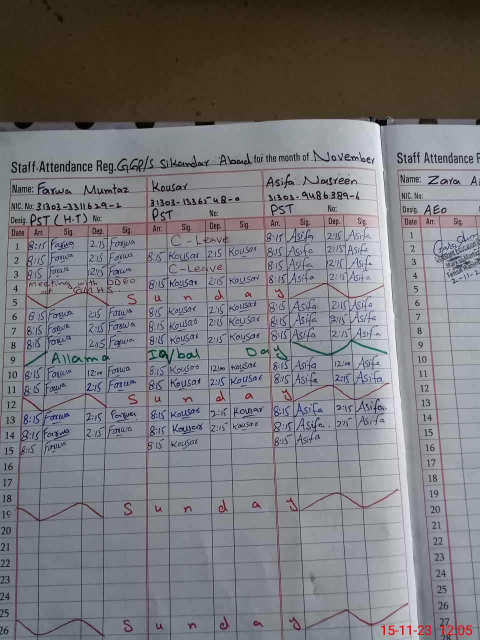 | CNIC | Full Name | Designation | R/C | Absence During Last Calender Month |