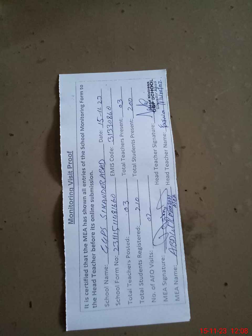| Attendance Register | Head Teacher | MEA with School | Visit Proof |