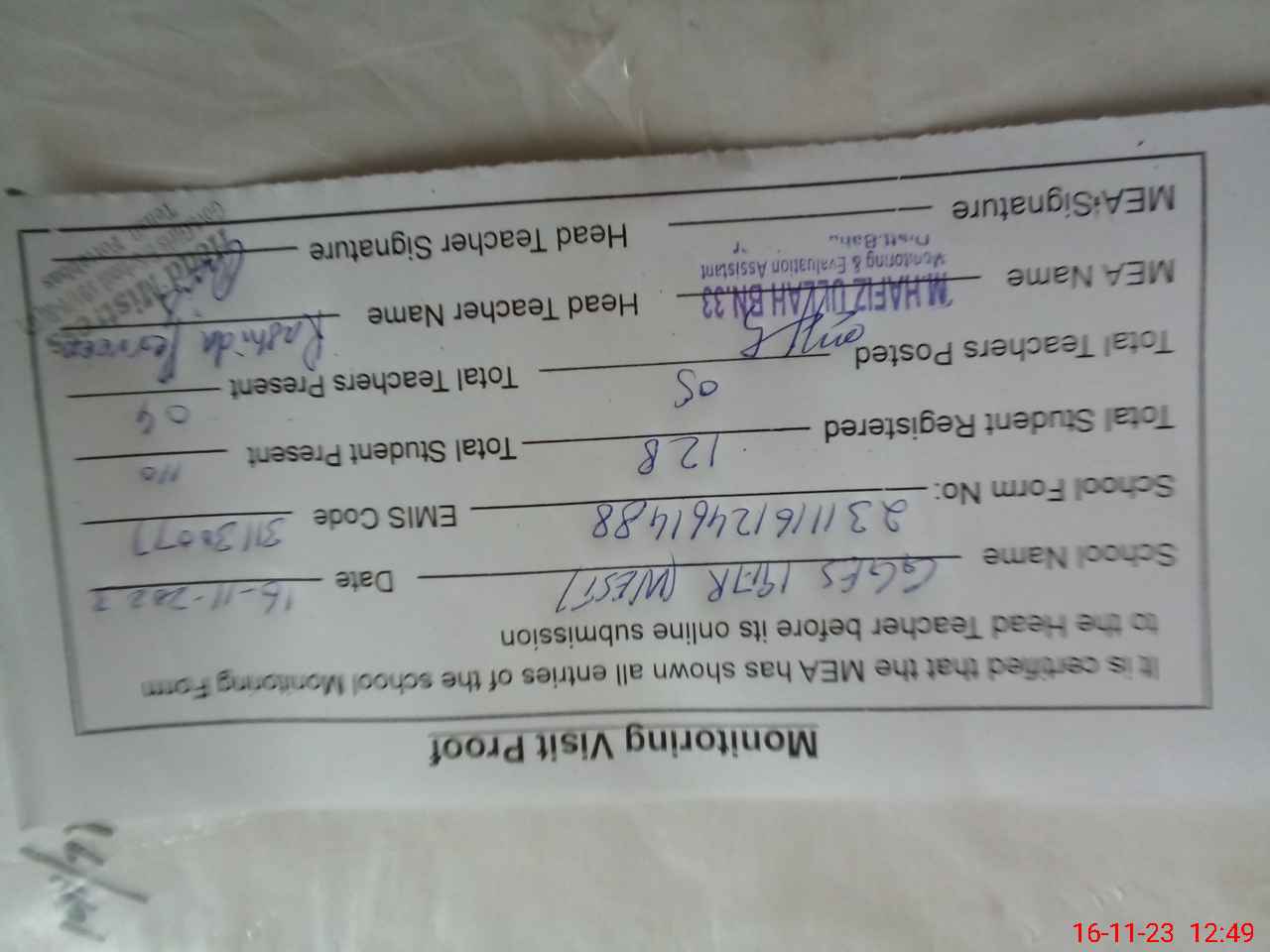 | Certified that this School was Inspected by the Undersigned MEA/DMO Today and the Information Stated Above is as Per Record. | |||||