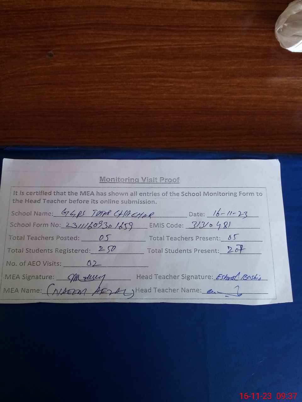 | Attendance Register | Head Teacher | MEA with School | Visit Proof |