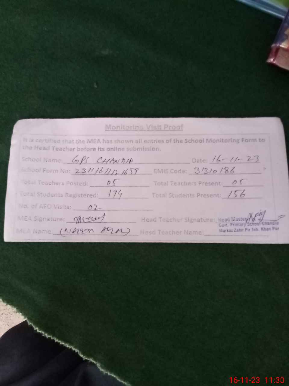 | EMIS Code: 31310186 | Name of School: GPS CHANDIA (After Noon) | |||