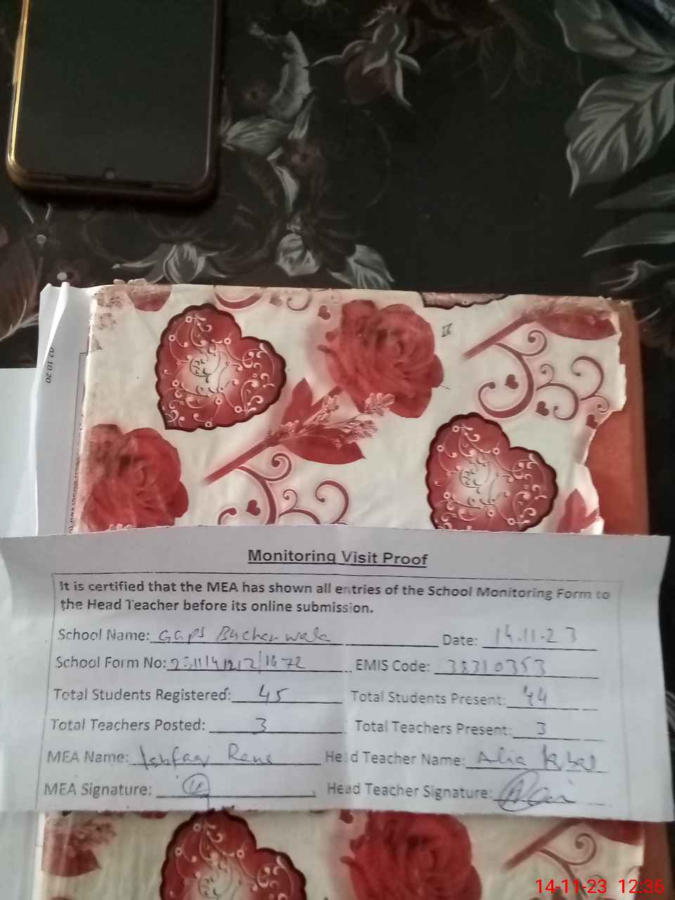 | Attendance Register | Head Teacher | MEA with School | Visit Proof |