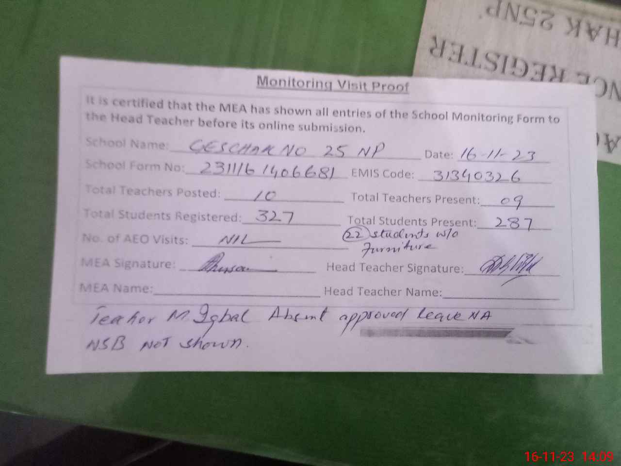 | EMIS Code: 31340326 | Name of School: GES CHAK NO 25/NP | |||