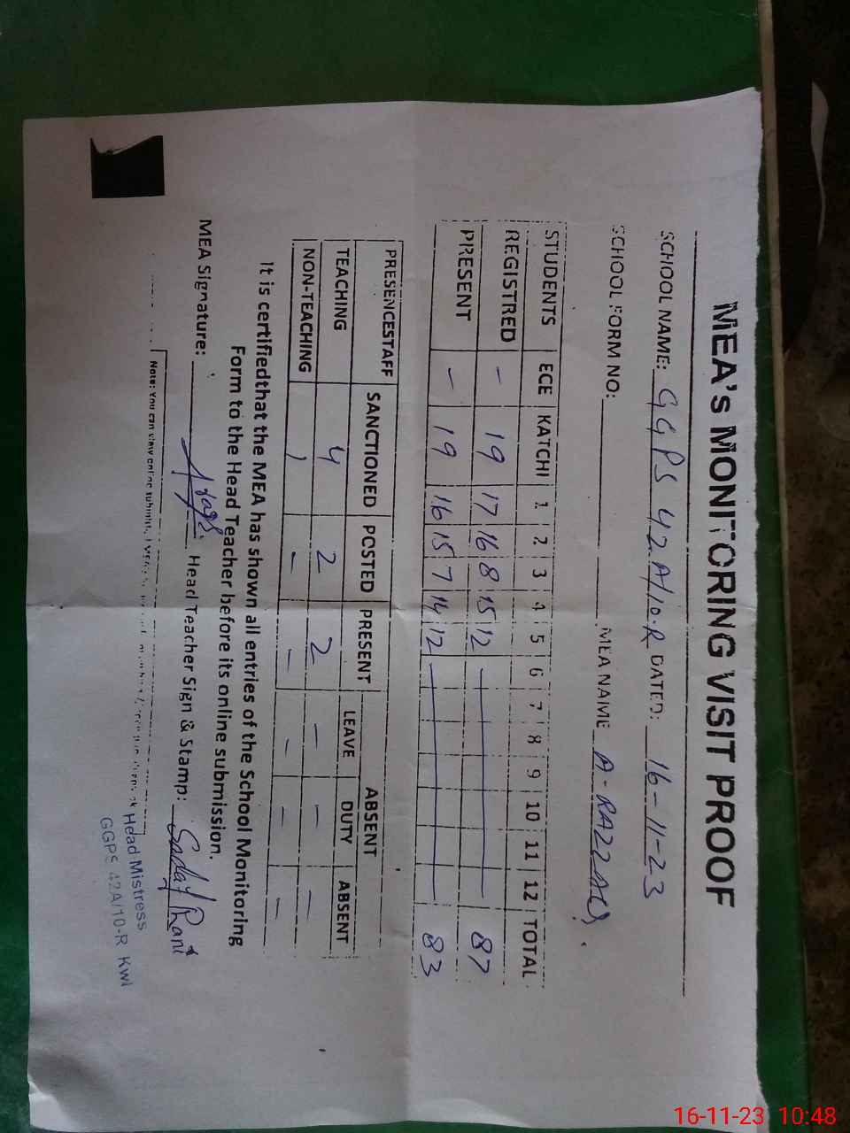| Attendance Register | Head Teacher | MEA with School | Visit Proof |
