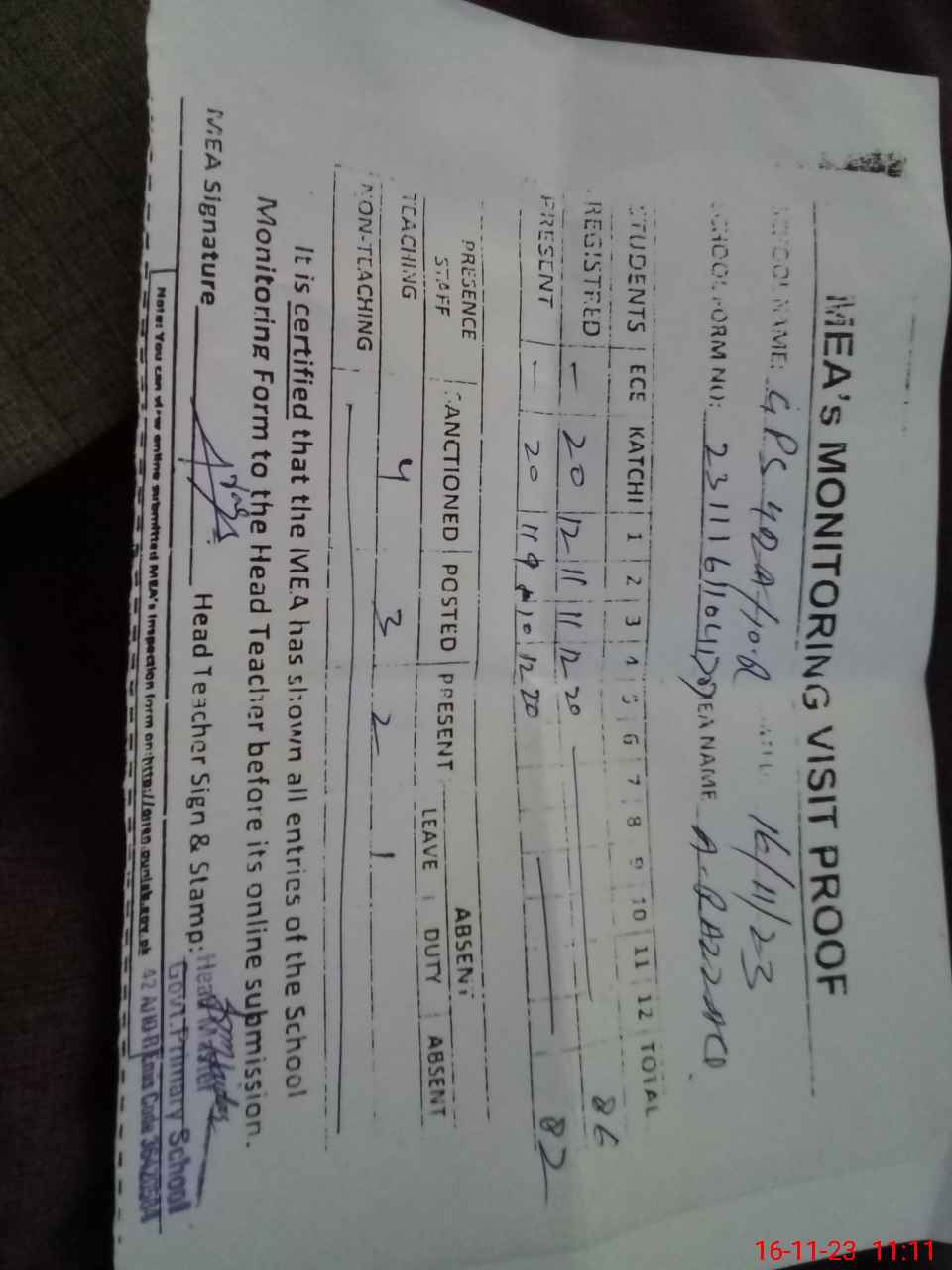 | Attendance Register | Head Teacher | MEA with School | Visit Proof |