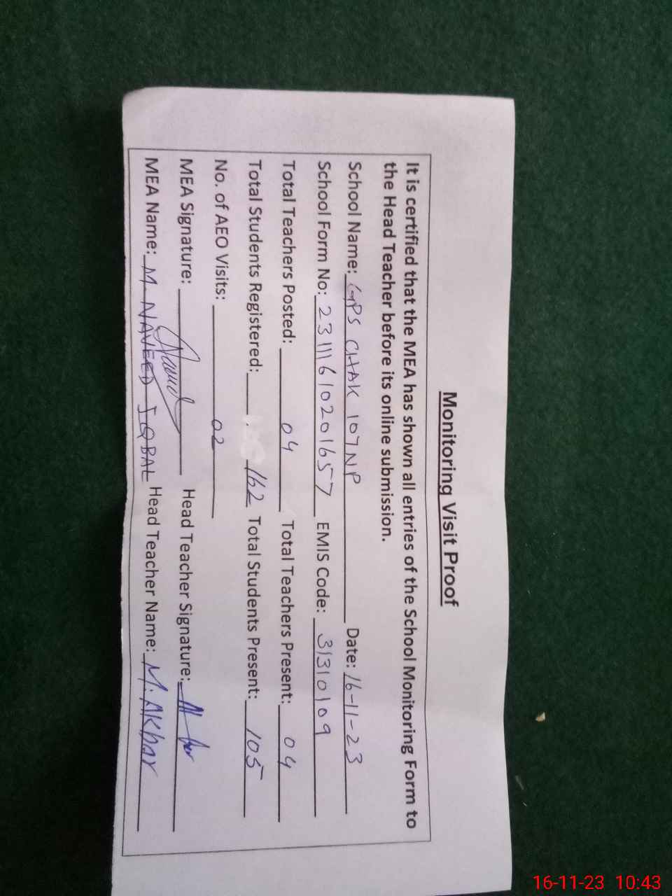 | Attendance Register | Head Teacher | MEA with School | Visit Proof |