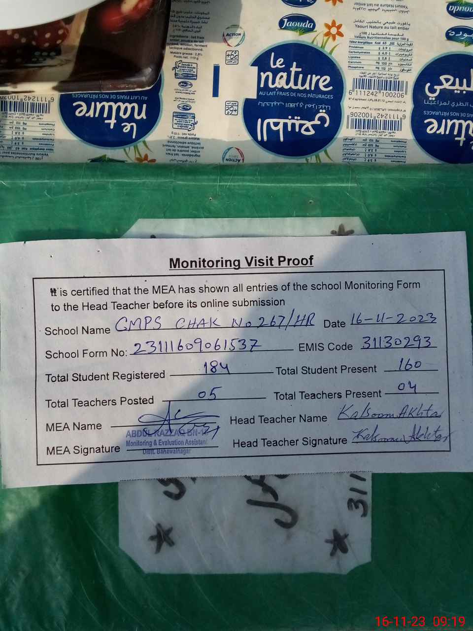 | Attendance Register | Head Teacher | MEA with School | Visit Proof |