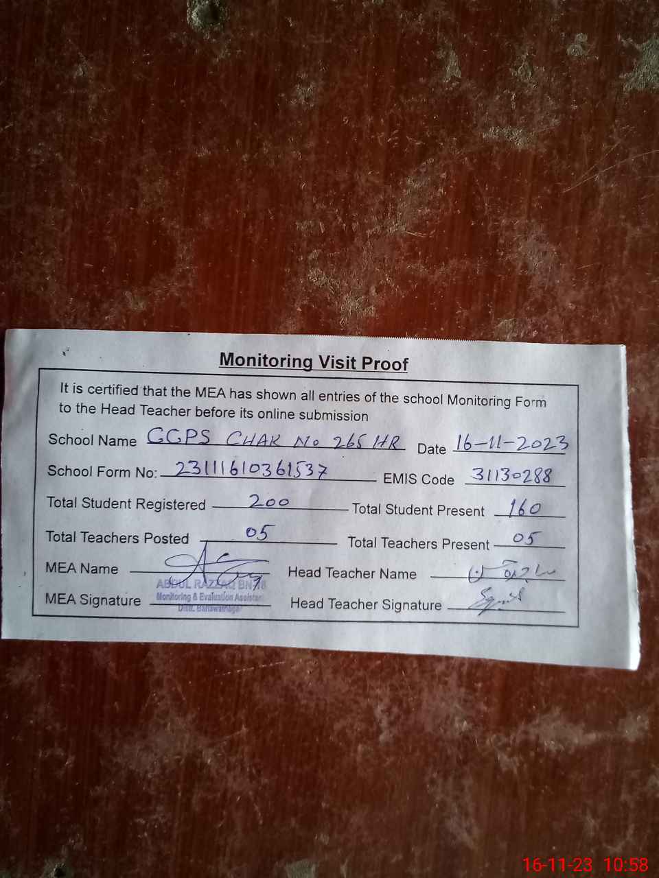 | Attendance Register | Head Teacher | MEA with School | Visit Proof |