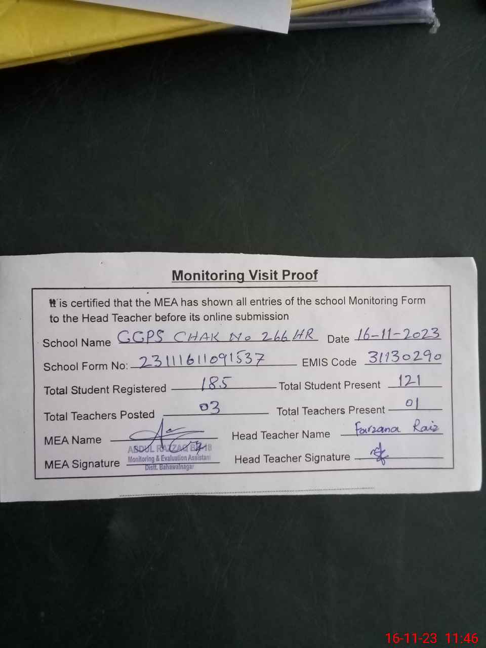 | Attendance Register | Head Teacher | MEA with School | Visit Proof |