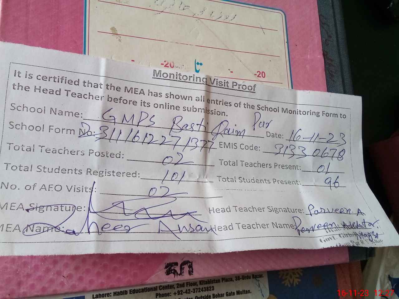 | Attendance Register | Head Teacher | MEA with School | Visit Proof |