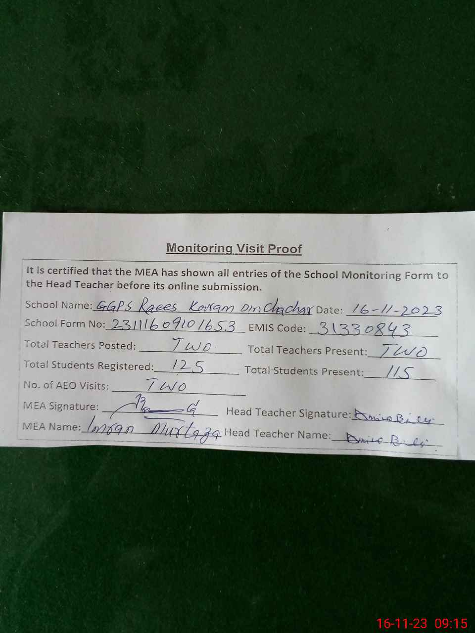 | EMIS Code: 31330843 | Name of School: GGPS RAEES KARAM DIN CHACHAR | |||
