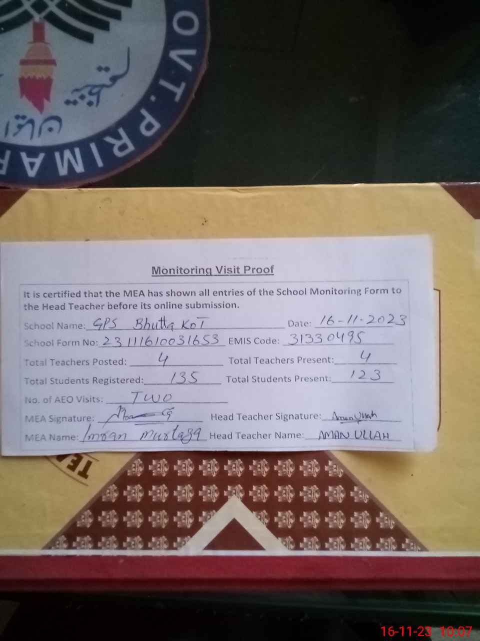 | Attendance Register | Head Teacher | MEA with School | Visit Proof |