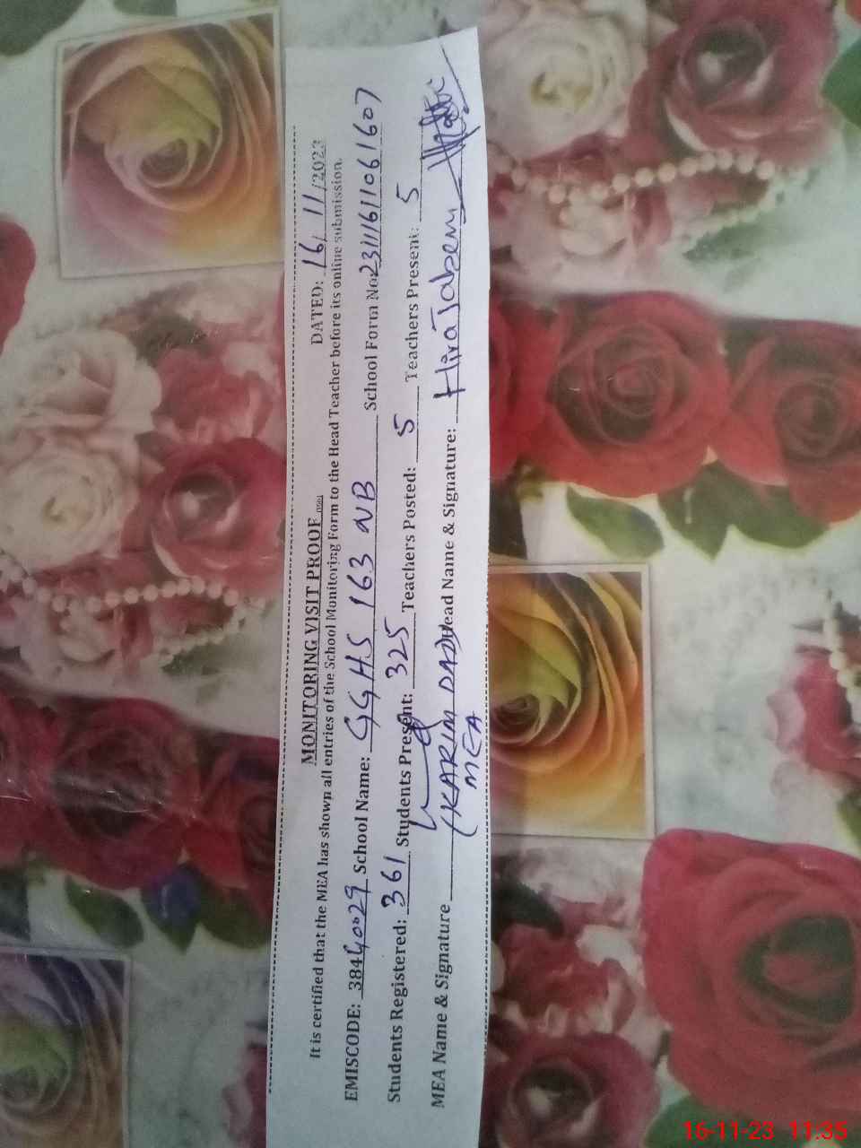 | Attendance Register | Head Teacher | MEA with School | Visit Proof |