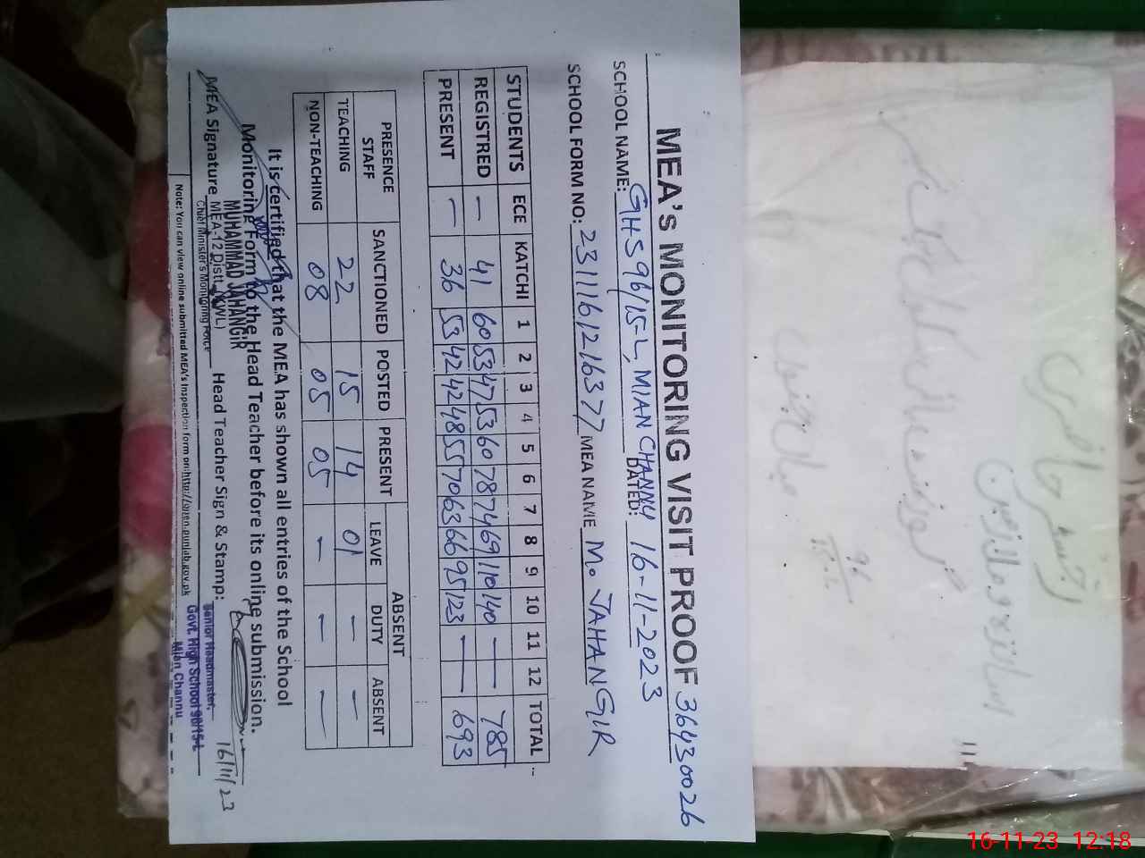 | EMIS Code: 36430026 | Name of School: GHS 96/15-L, MIAN CHANNU | |||