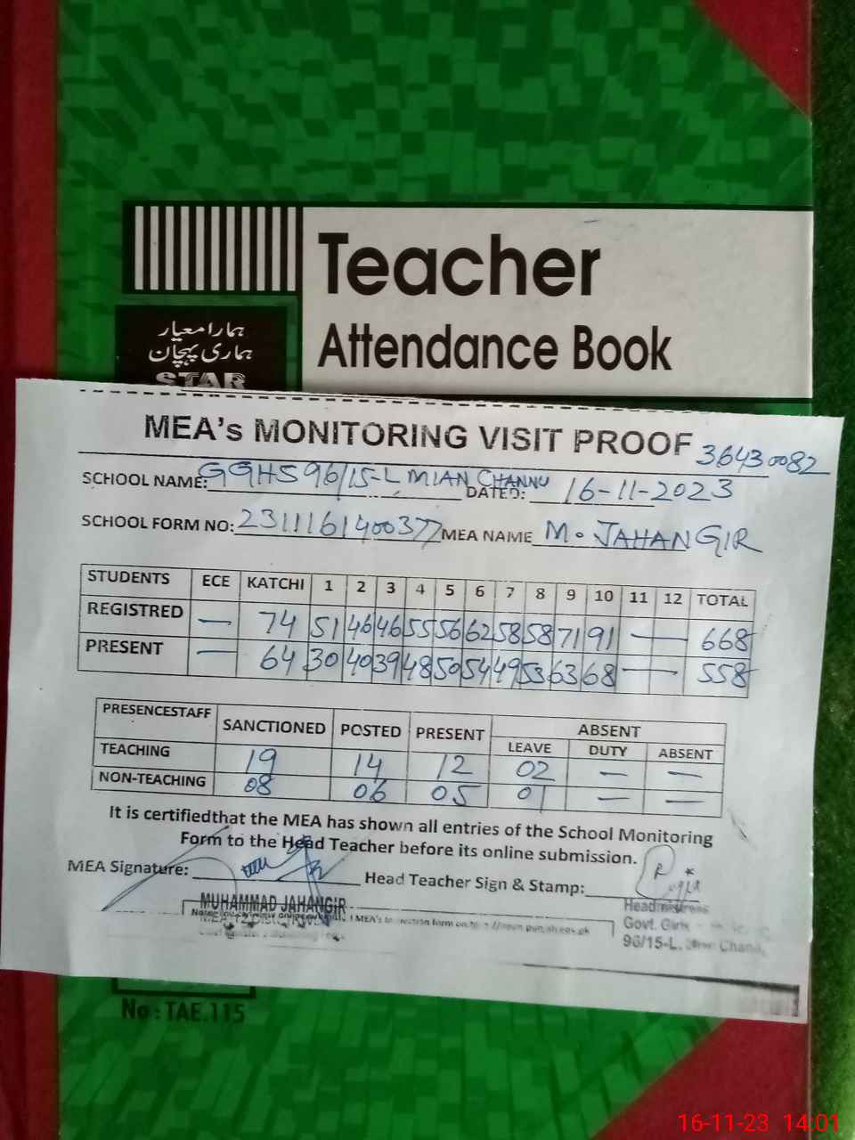| Attendance Register | Head Teacher | MEA with School | Visit Proof |