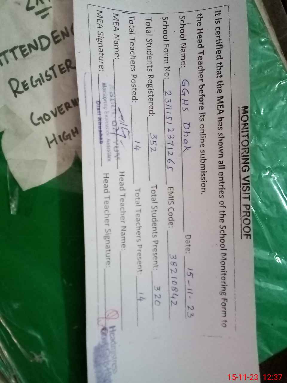 | Attendance Register | Head Teacher | MEA with School | Visit Proof |