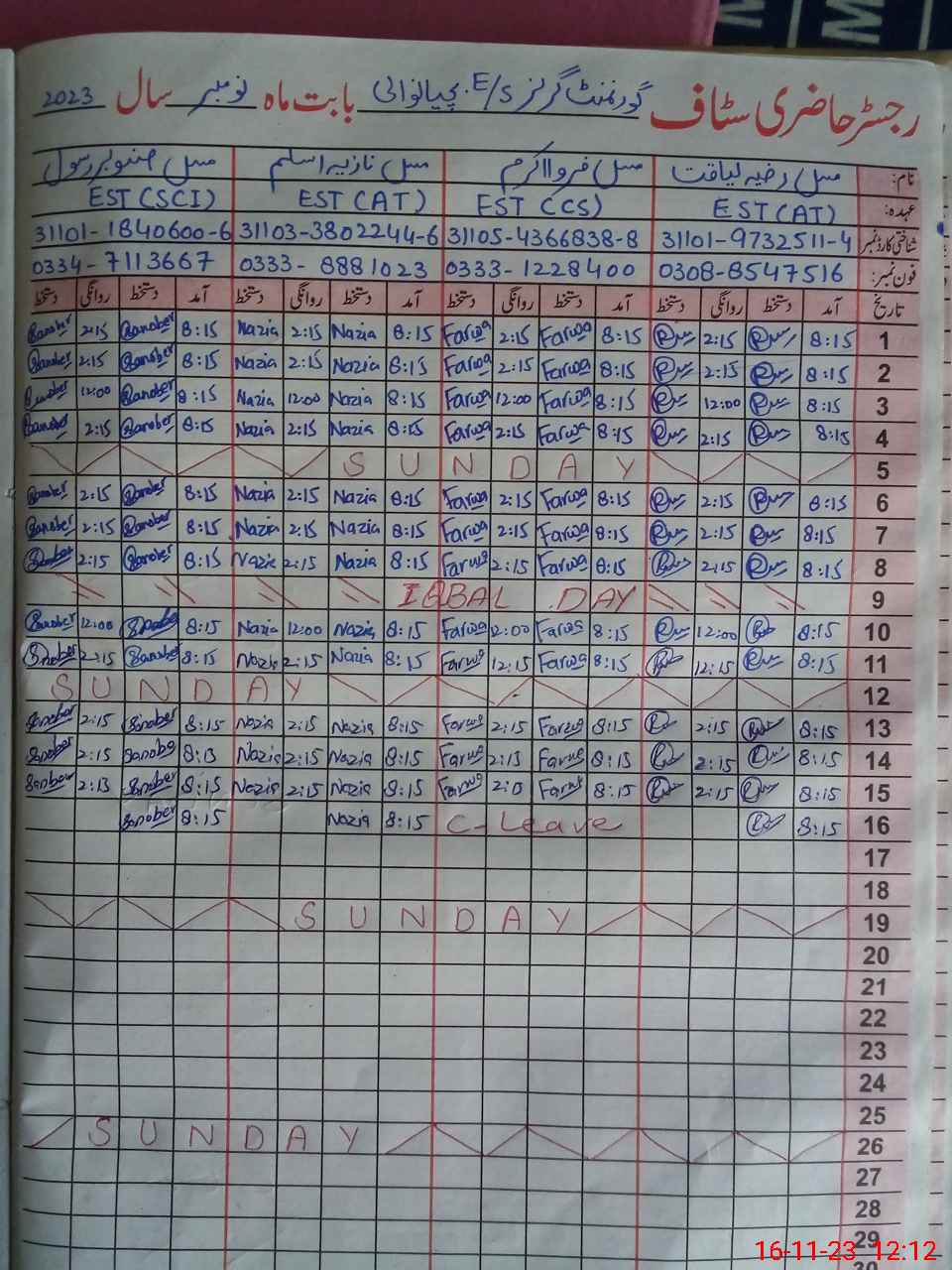 | CNIC | Full Name | Designation | R/C | Absence During Last Calender Month |