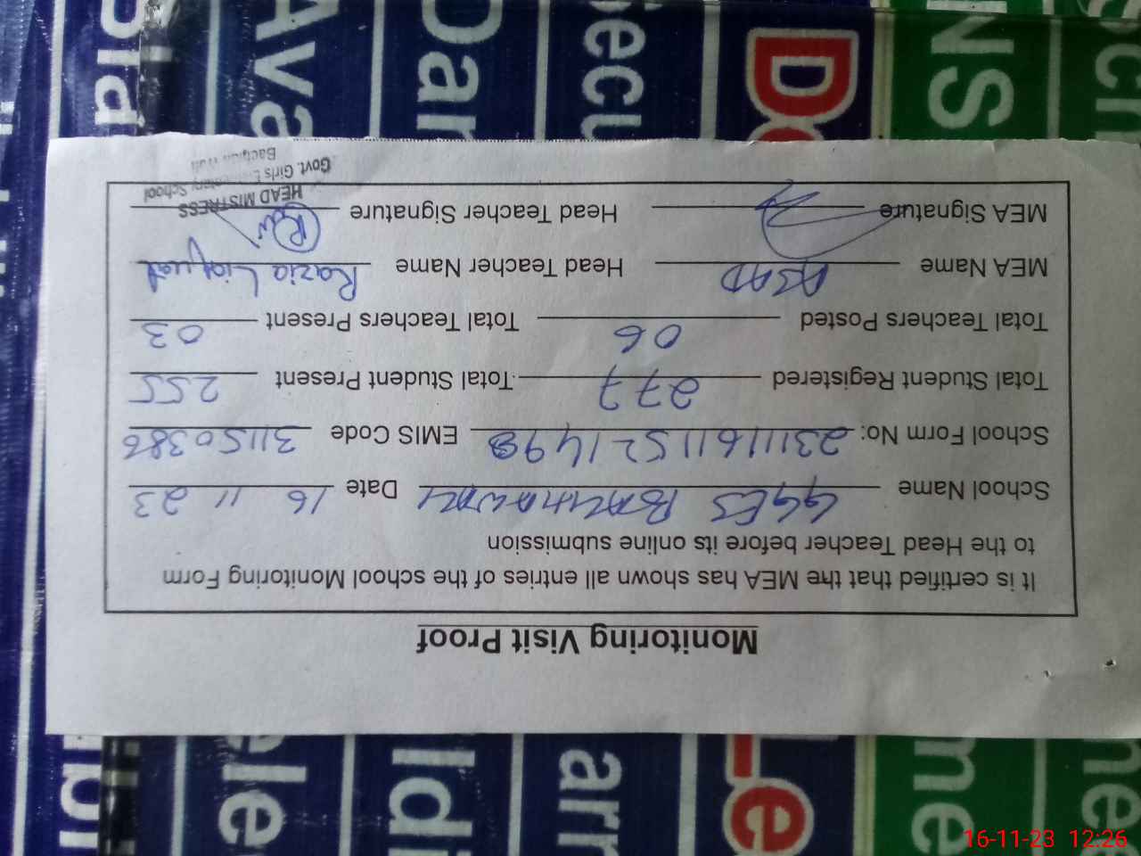 | Attendance Register | Head Teacher | MEA with School | Visit Proof |