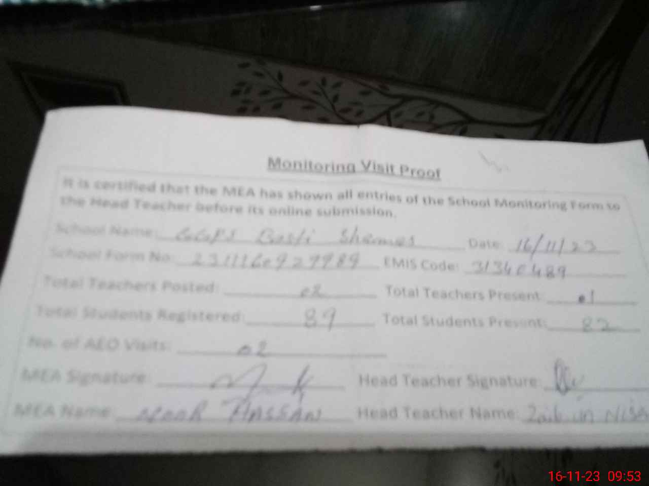 | Attendance Register | Head Teacher | MEA with School | Visit Proof |