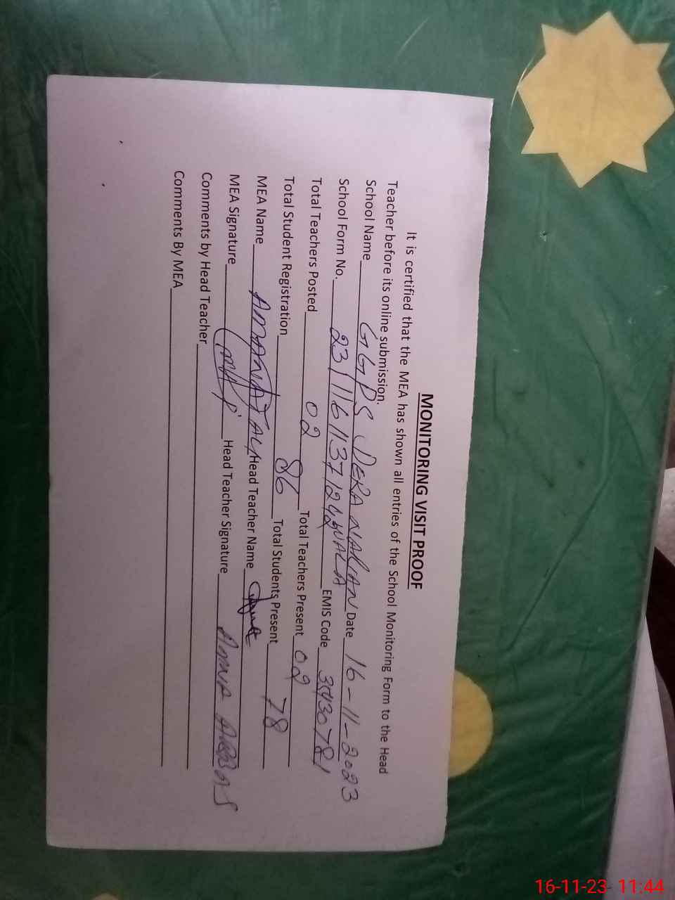 | Attendance Register | Head Teacher | MEA with School | Visit Proof |