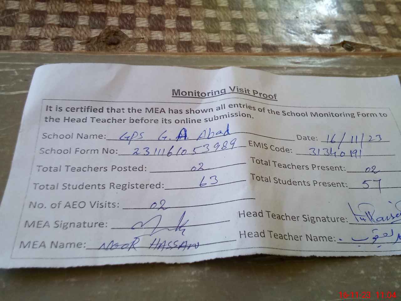 | Attendance Register | Head Teacher | MEA with School | Visit Proof |