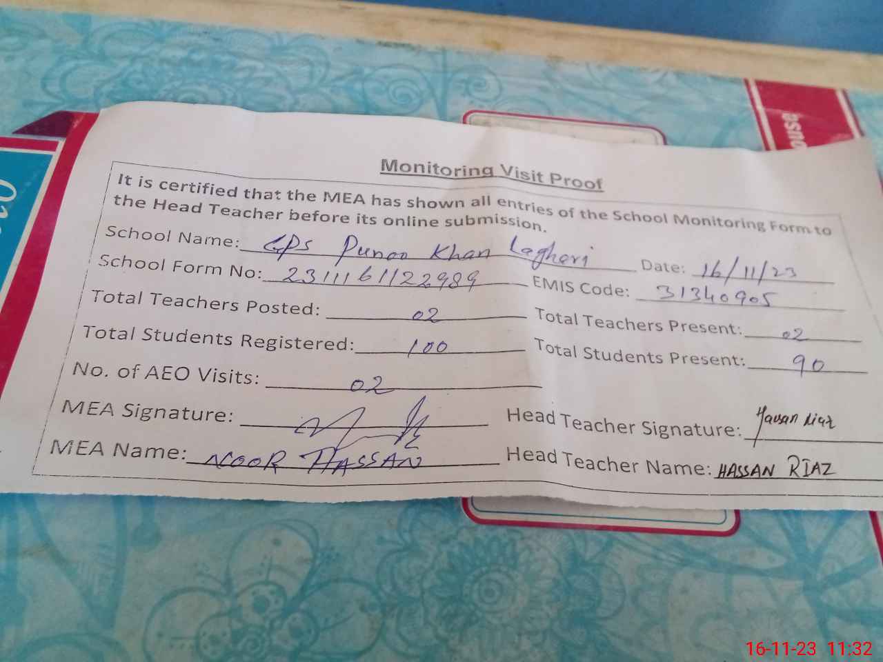 | EMIS Code: 31340905 | Name of School: GPS PUNOO KHAN LAGHARI | |||