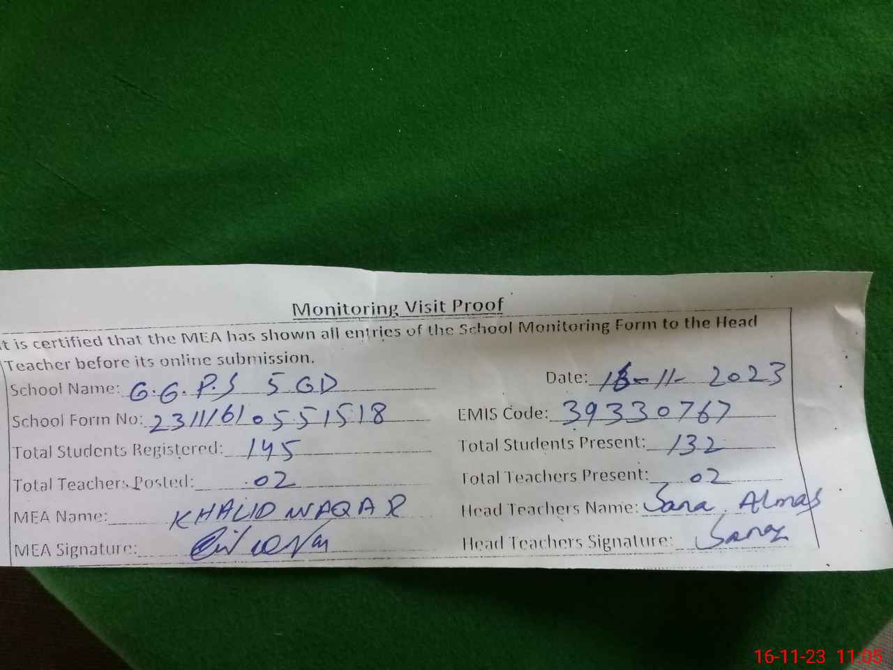 | Monitoring Date: 16-11-2023 | Start Time: 16-11-2023 10:54 AM | End Time: 16-11-2023 11:07 AM | Name of MEA: KH**** WA**** | |