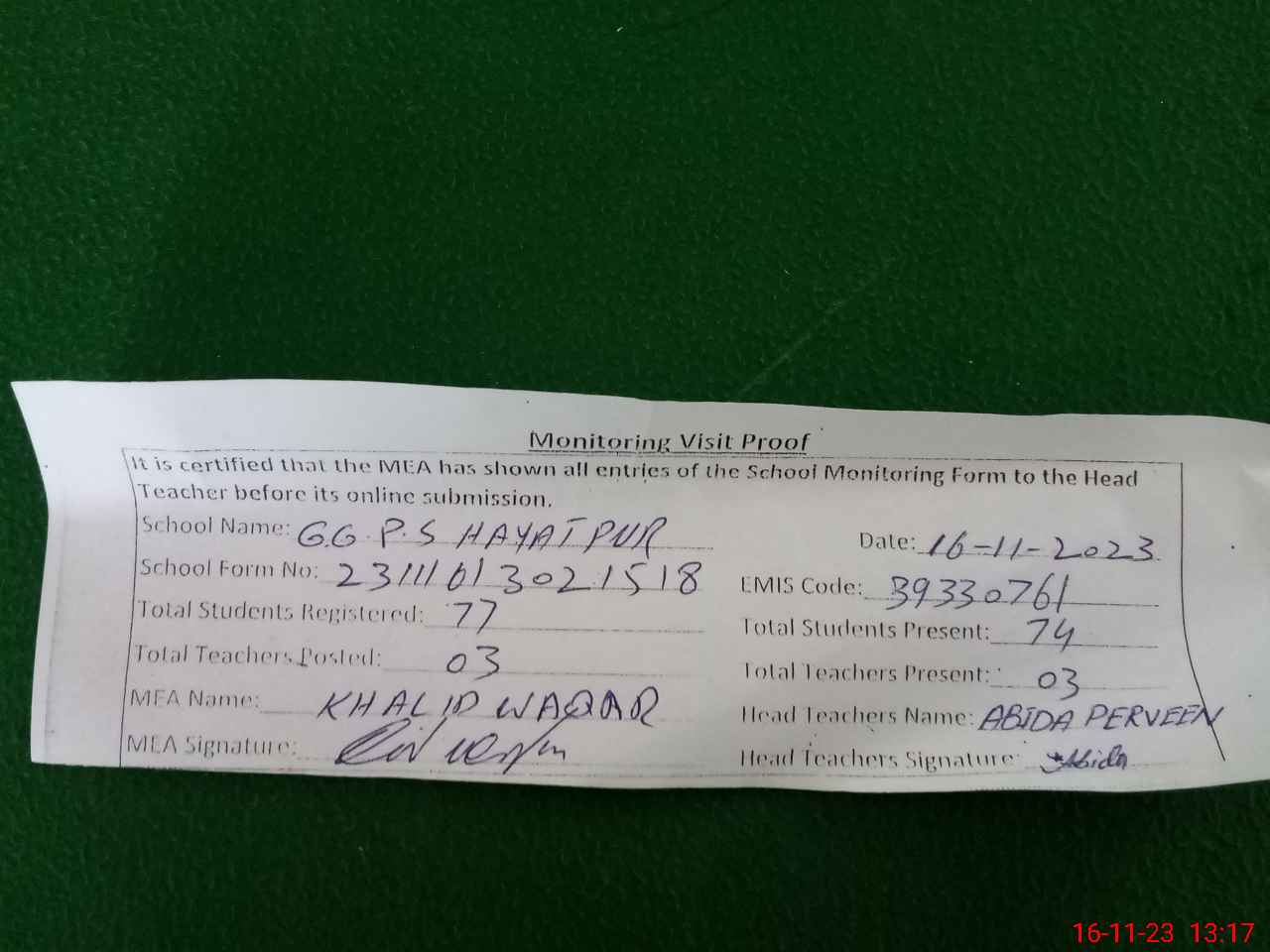 | EMIS Code: 39330761 | Name of School: GGPS HAYAT PUR | |||