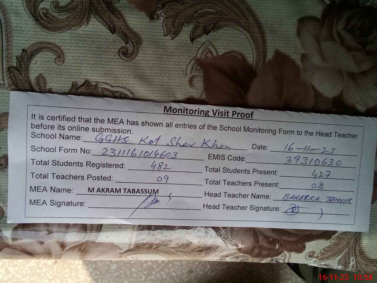 | EMIS Code: 39310630 | Name of School: GGHS KOT SHER KHAN | |||