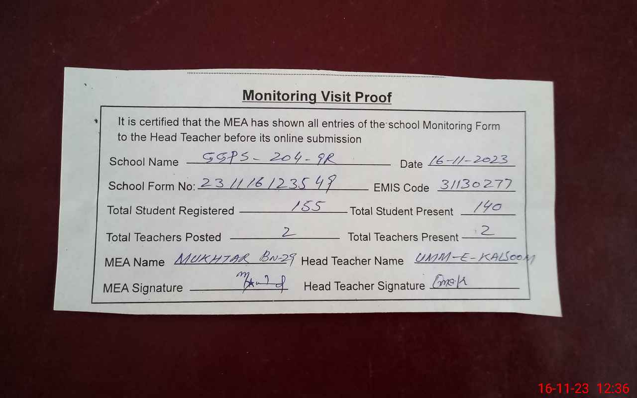 | Attendance Register | Head Teacher | MEA with School | Visit Proof |