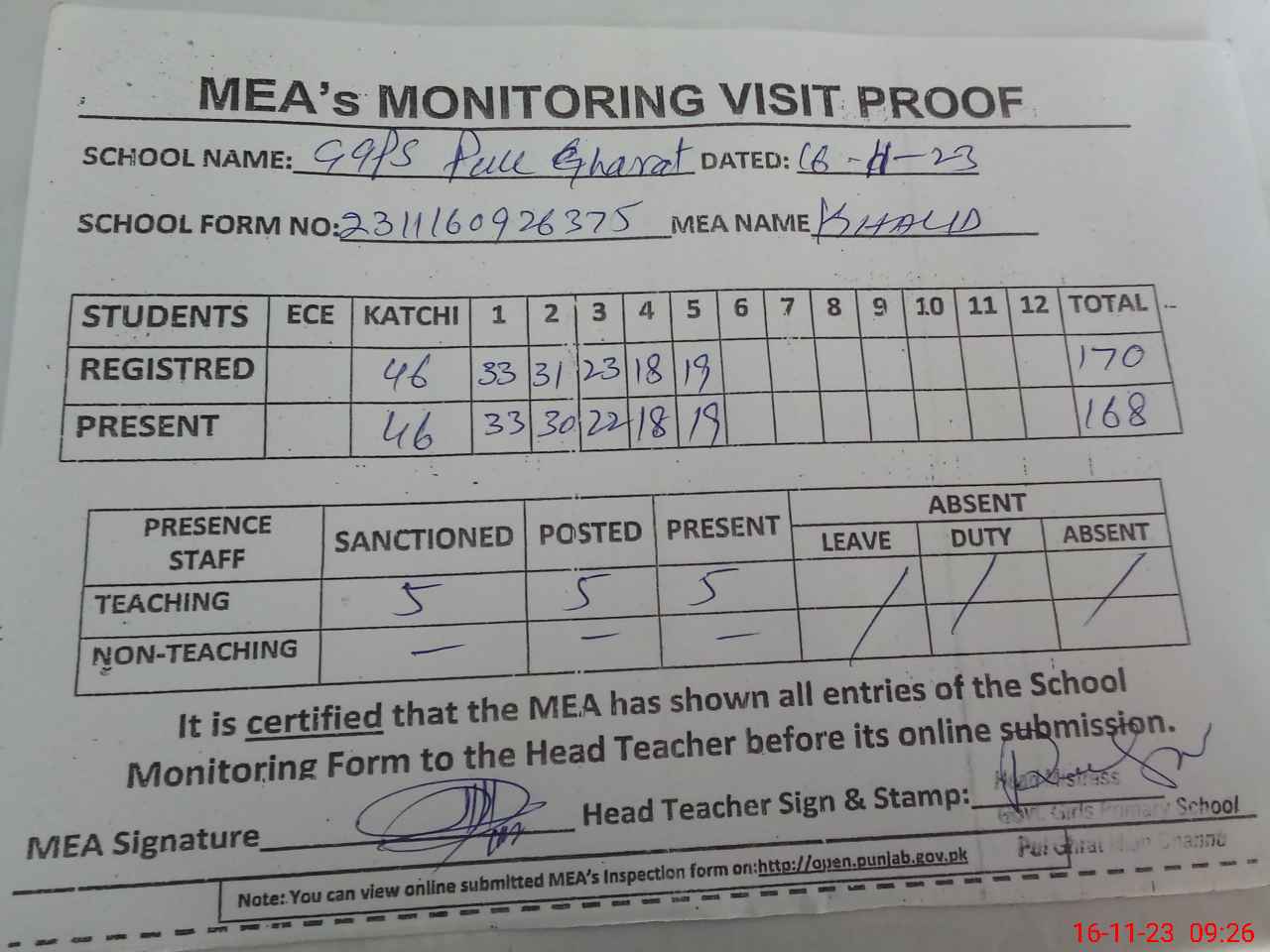 | Attendance Register | Head Teacher | MEA with School | Visit Proof |