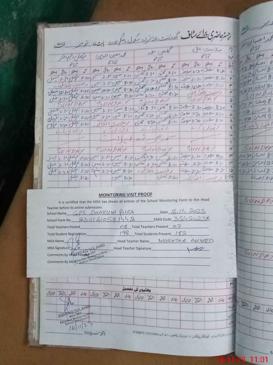 | Attendance Register | Head Teacher | MEA with School | Visit Proof |