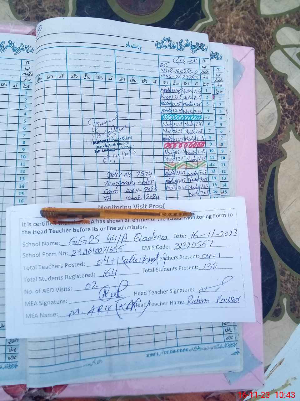 | Attendance Register | Head Teacher | MEA with School | Visit Proof |