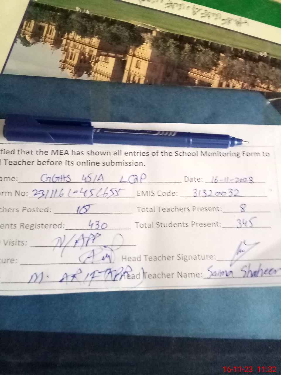 | Attendance Register | Head Teacher | MEA with School | Visit Proof |