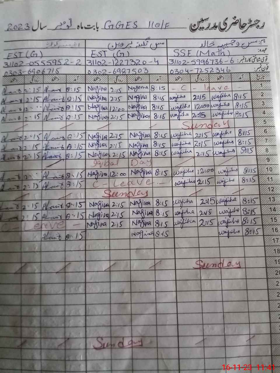 | CNIC | Full Name | Designation | R/C | Absence During Last Calender Month |