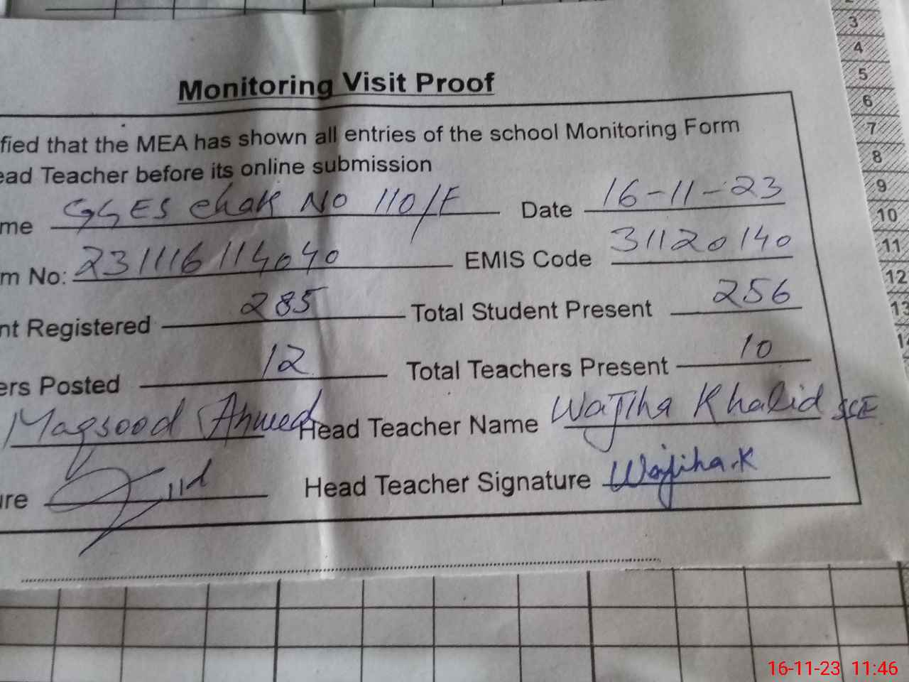 | Attendance Register | Head Teacher | MEA with School | Visit Proof |