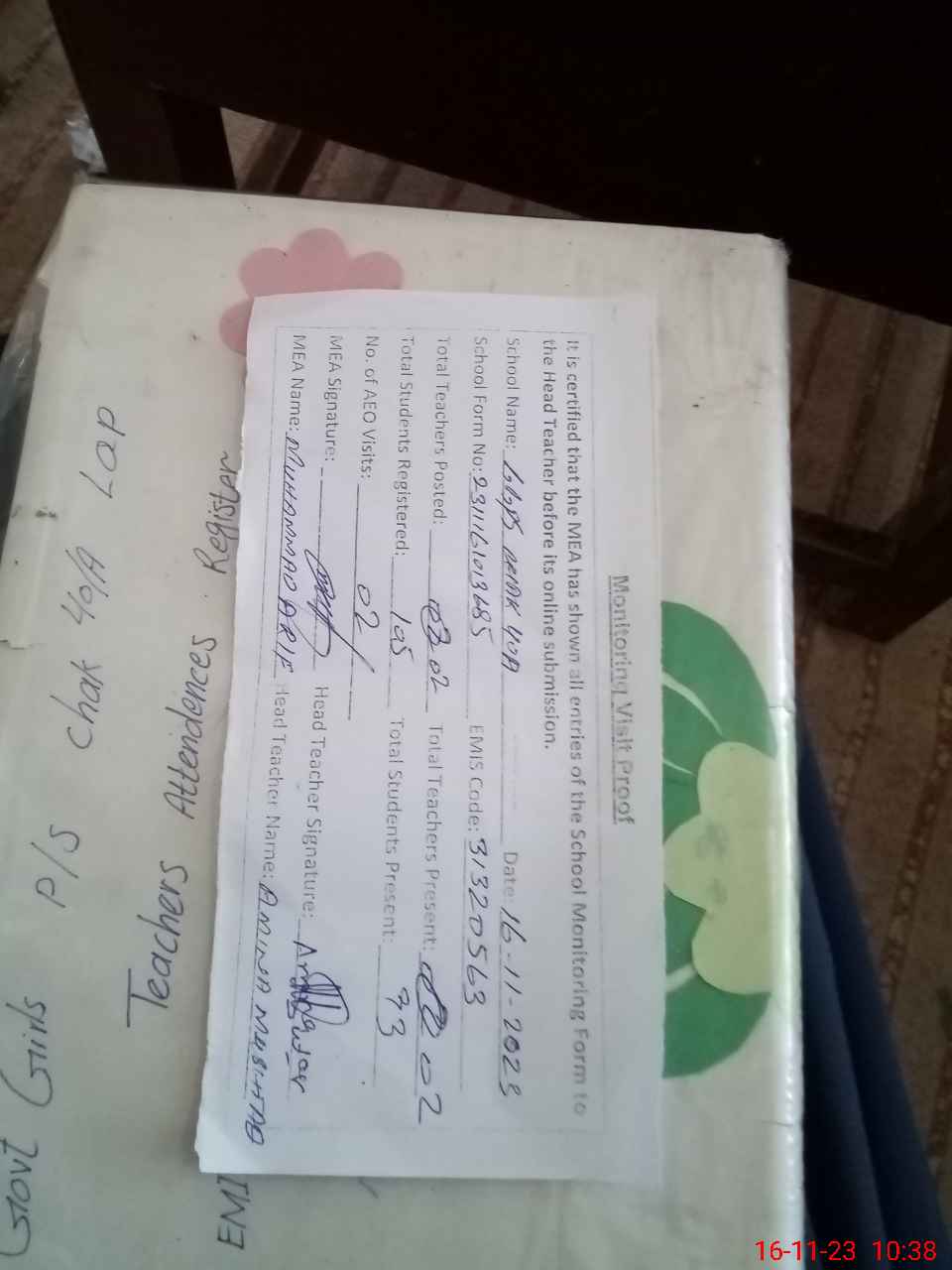 | Attendance Register | Head Teacher | MEA with School | Visit Proof |