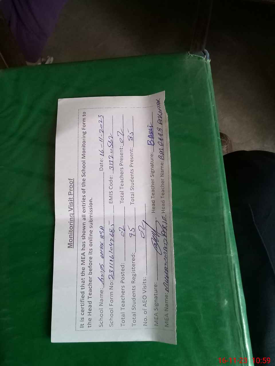 | Attendance Register | Head Teacher | MEA with School | Visit Proof |