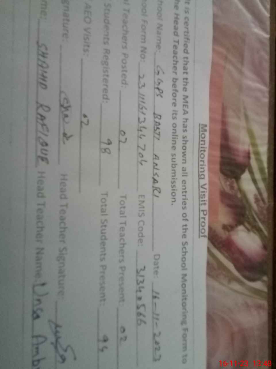 | EMIS Code: 31340566 | Name of School: GGPS ANSARI BASTI | |||