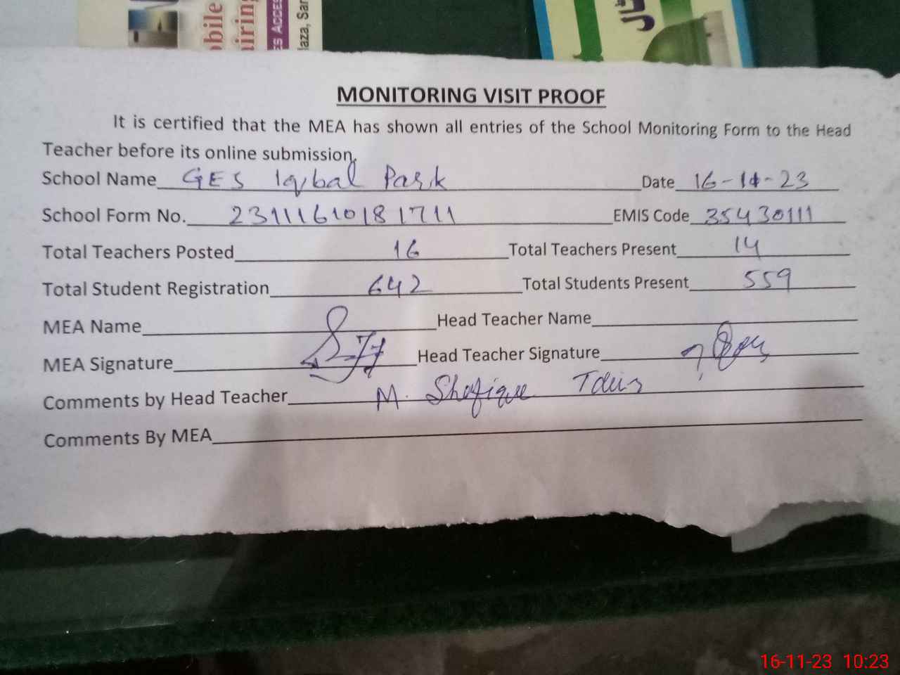 | EMIS Code: 35430111 | Name of School: GES MC ALLAMA IQBAL PARK | |||