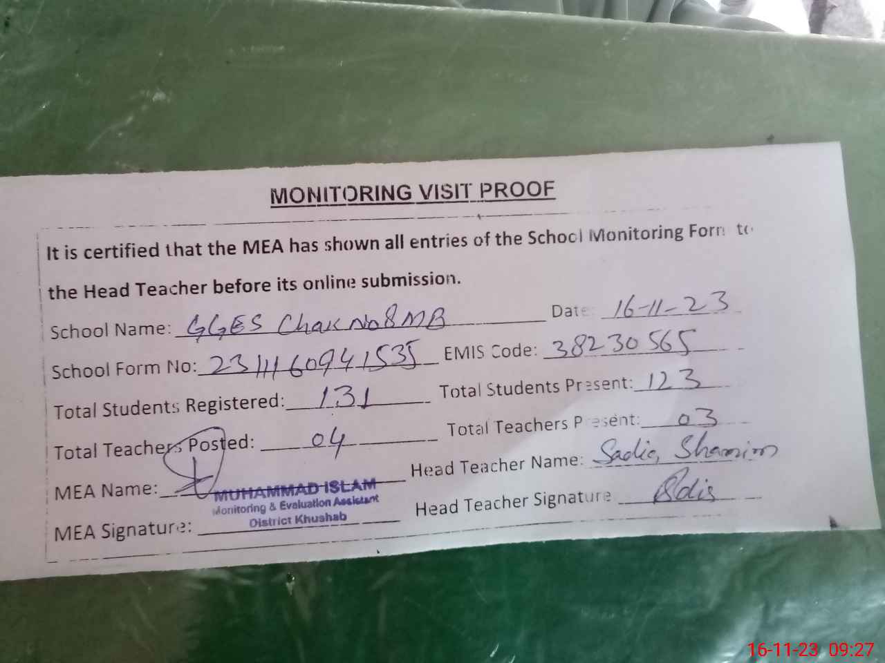 | Attendance Register | Head Teacher | MEA with School | Visit Proof |