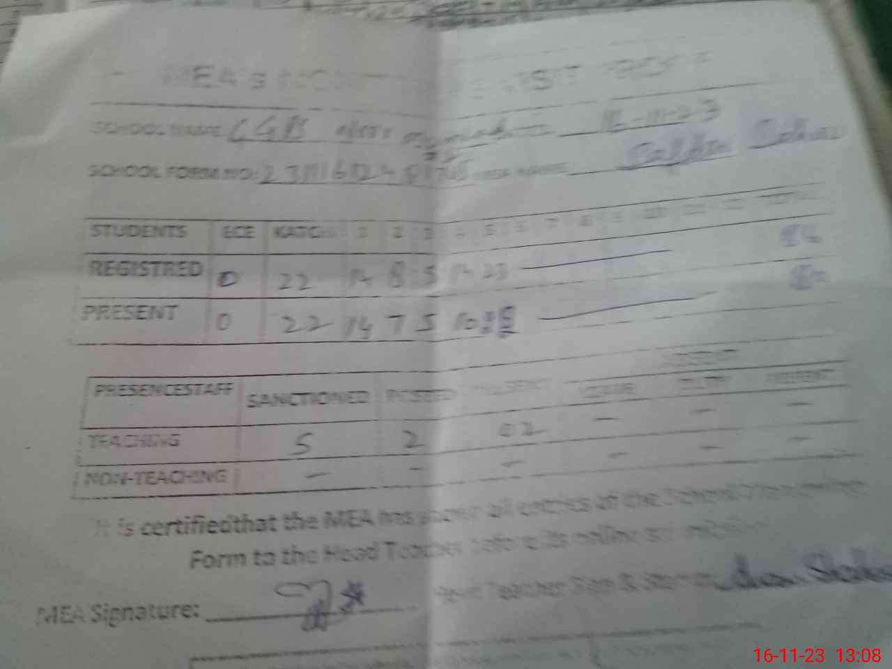 | Attendance Register | Head Teacher | MEA with School | Visit Proof |