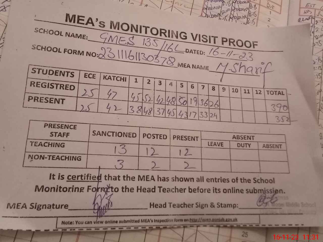 | Attendance Register | Head Teacher | MEA with School | Visit Proof |