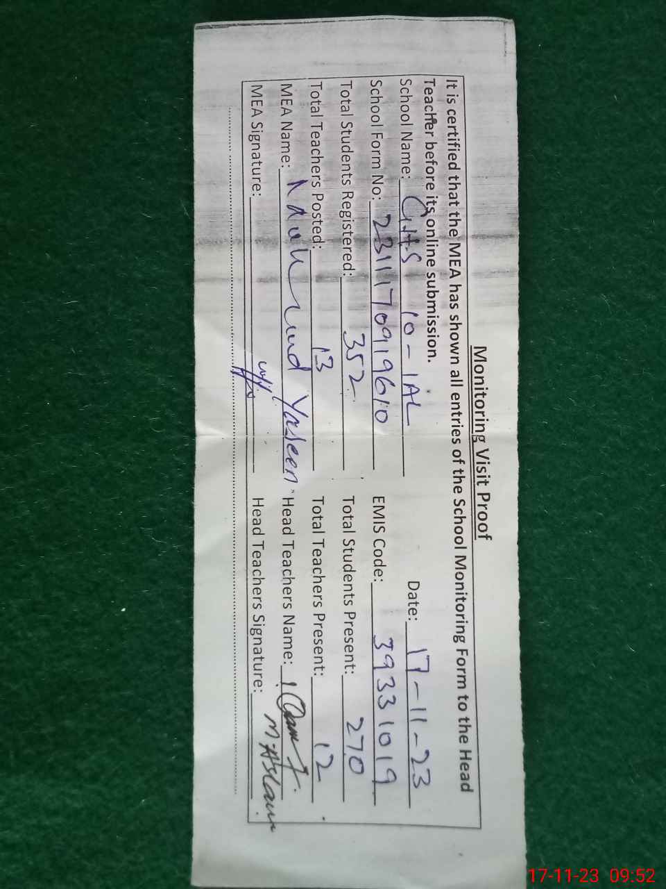 | Attendance Register | Head Teacher | MEA with School | Visit Proof |