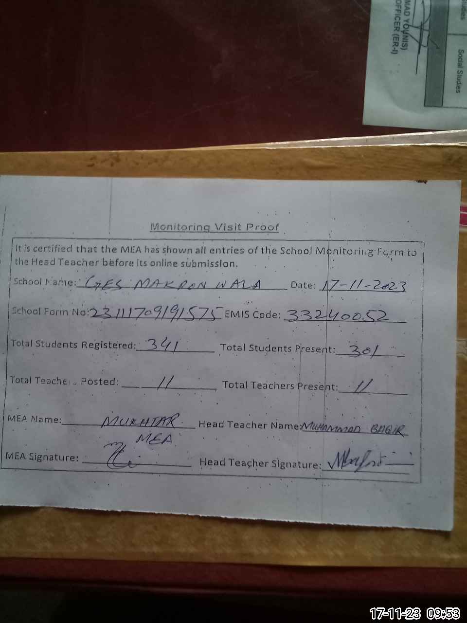 | Attendance Register | Head Teacher | MEA with School | Visit Proof |