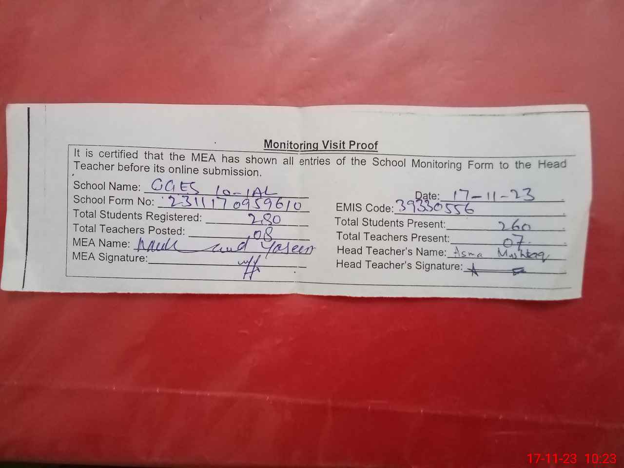 | Attendance Register | Head Teacher | MEA with School | Visit Proof |