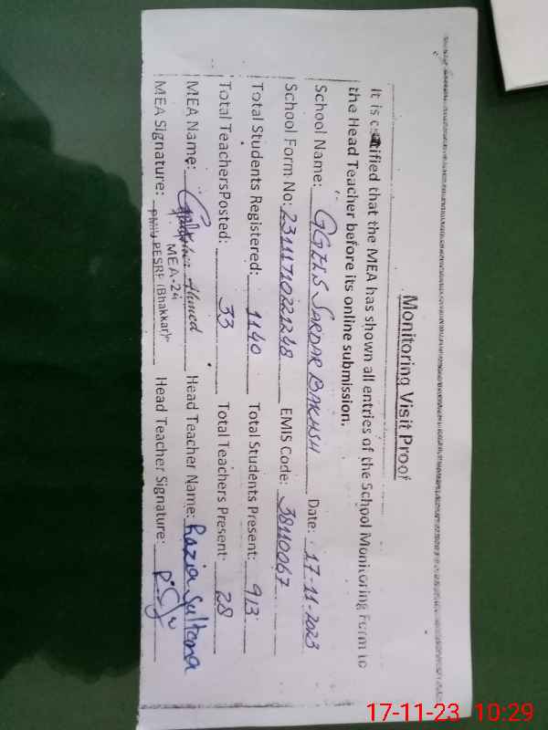 | EMIS Code: 38110067 | Name of School: GGHS SARDAR BAKHSH | |||