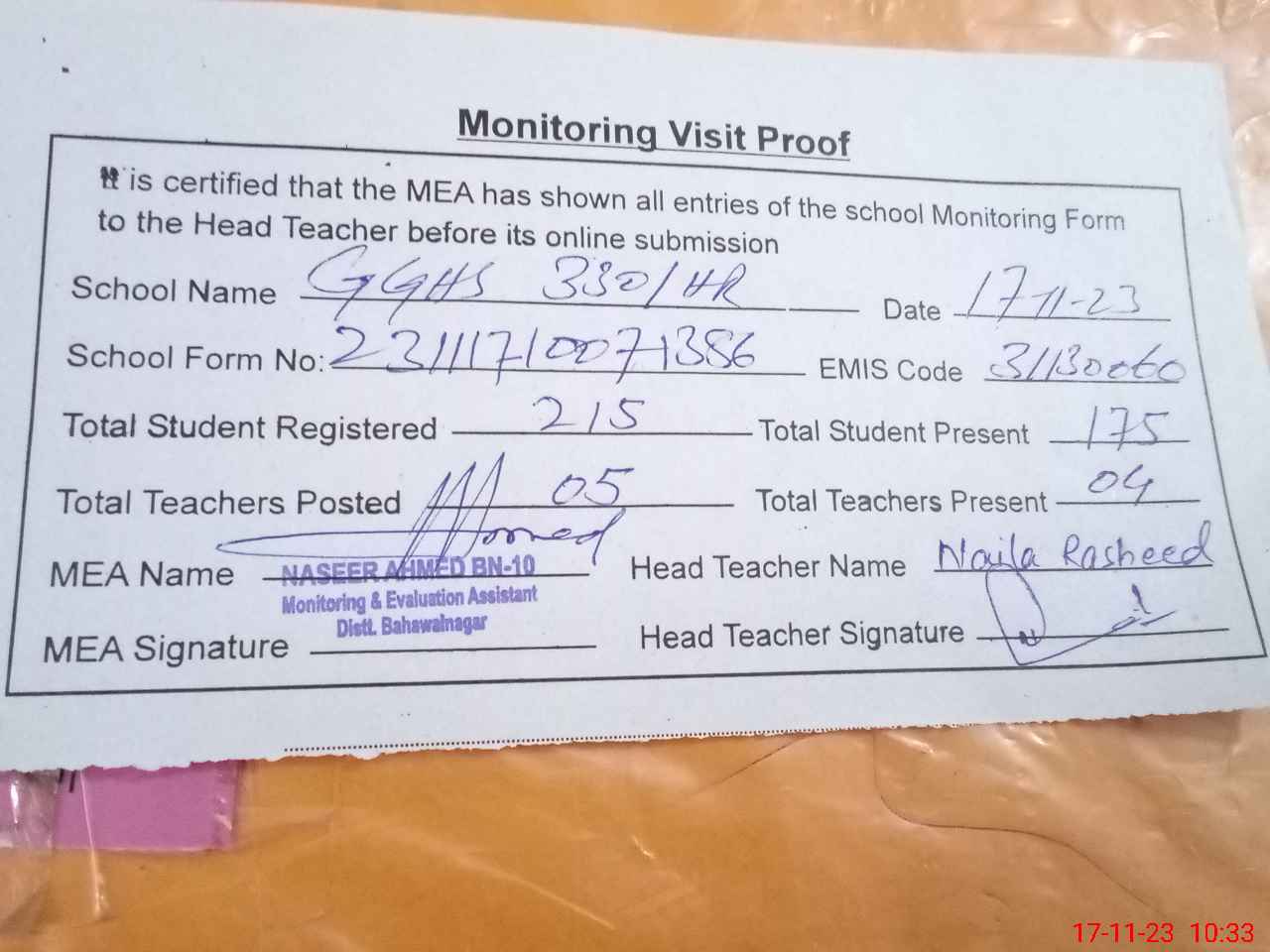 | EMIS Code: 31130060 | Name of School: GGHS CHAK NO 330 HR | |||